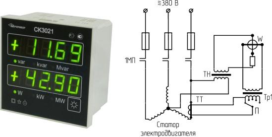Измерители активной и реактивной мощности. Цифровой щитовой ваттварметр CK 3021 (рис. 2.34, а) широко применяется для измерения и непрерывной записи активной или реактивной мощности в сетях трехфазного переменного тока частотой 50 Гц без нулевого провода с неравномерной нагрузкой фаз. Ваттварметр CK 3021 измеряет действующие значения тока, напряжения, активную и реактивную мощности, частоту сети и передает измеренные значения параметров сети по гальванически развязанному интерфейсу RS485. Подключается прибор непосредственно к измерительному трансформатору тока ТТ и измерительному трансформатору напряжения ТН по схеме (рис. 2.34, б) и измеряет мощность одной из фаз асинхронного электродвигателя бурового станка.