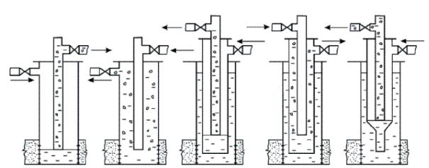 мы в скважину спускают два ряда НКТД, один из которых (наружный ряд) ступенчатый; в верхней части – трубы большего диаметра, а в нижней – меньшего диаметра. Сжатый газ нагнетают в кольцевое пространство междубвнутренним и наружным рядами НКТ, а газожидкостная смесь поднимается по внутреннему ряду.