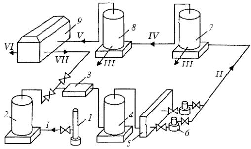 1 – газовая скважина высокого давления; 2, 4, 8 – газовые сепараторы; 3 – теплообменник; 5 – газораспределительная батарея; 6 – газлифтная скважина;