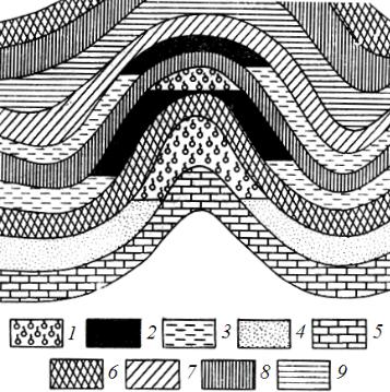 Нефть и газ в нефтяных и газовых залежах насыщают пустоты между зернами, трещины и каверны пород, слагающих пласты. Большинство нефтегазовых месторождений приурочены к осадочным породам – хорошим коллекторам нефти (пески, песчаники, конгломераты, трещиноватые и кавернозные известняки и доломиты). Естественные резервуары нефти и газа по происхождению и геометрической форме могут быть самыми различными. Простейшая природная структурная ловушка – антиклинальная складка (рис. 1.1).
