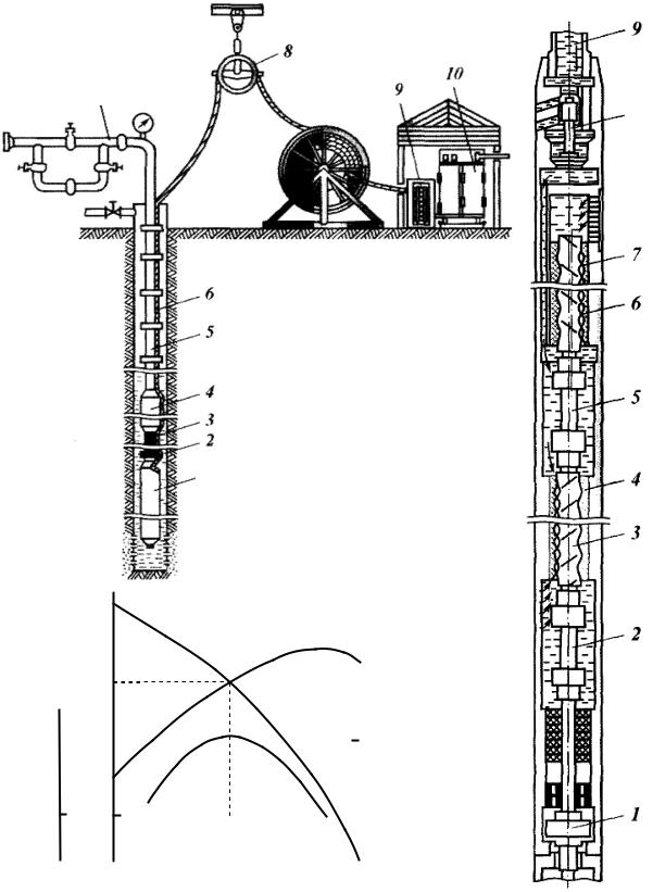 УЭЦН (рис. 3.11, а) состоит из насосного агрегата, бронированного кабеля 6, устьевой арматуры 7, кабельного барабана станции управления 10 и автотрансформатора 9. Погружной насосный агрегат, в собранном виде спускаемый в скважину на подъемных трубах 5, состоит из центробежного многоступенчатого насоса 4, погружного