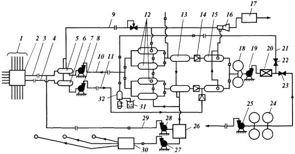 Схема высоконапорной герметизированной УКПН, применяемой на крупных месторождениях, приведена на рис. 4.2. Нефть, газ и вода, поступившие на поверхность, под устьевым давлением (≈ 1,5 МПа) по выкидным линиям 1 направляются в АГЗУ 2. Затем