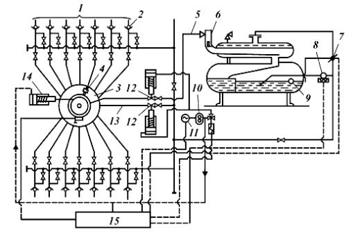 9 – регулятор уровня; 10 – гидроносос; 11 – электродвигатель; 12 – отсекатели; 13 – сборныйбколлектор; 14 – силовой цилиндр; 15 – блок автоматики