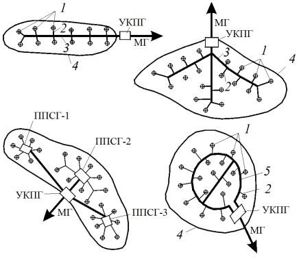 го сбора газа: линейную, лучевую, кольцевую и групповую (рис. 4.4).