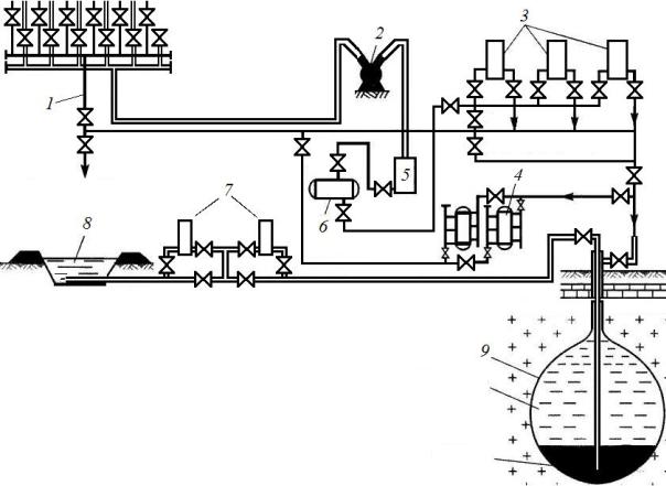 1 – железобетонная эстакада; 2 – компрессор; 3 – насосы для перекачки нефтепродуктаи; 4 – установка для осушки газа; 5 – конденсатор; 6 – сборник конденсата; 7 – насосы для перекачки рассола; 8 – хранилище рассола; 9 – подземная емкость