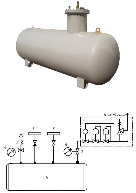 1 – наполнительный клапан; 2 – клапан отбора паровой фазы; 3 – клапан отбора жидкой фазы; 4 – указатель наполнения газгольдера; 5 – предохранительный клапан; 6 – манометр; 7 – регулятор давления; 8 – газгольдер