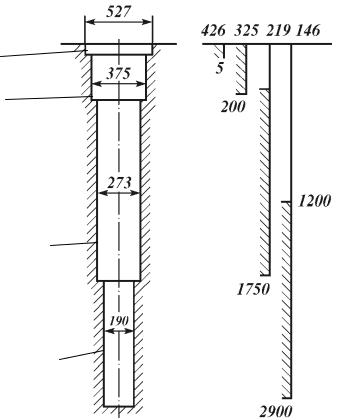 Под конструкцией скважины понимается совокупность данных о числе и размерах (диаметр и длина) обсадных колонн, диаметрах ствола скважины под каждую колонну, интервалах цементирования, а также о способах и интервалах соединения скважины с продуктивным пластом (рис. 2.3). На рабочей схеме конструкции скважины (рис. 2.3, б) вверху над каждым рядом обсадных колонн пишется диаметр (мм), а внизу − глубина (м) трубы; интервал подъема цементного раствора обозначается штриховкой, выше которой отмечается высота его подъема; иногда приводится номер долота.