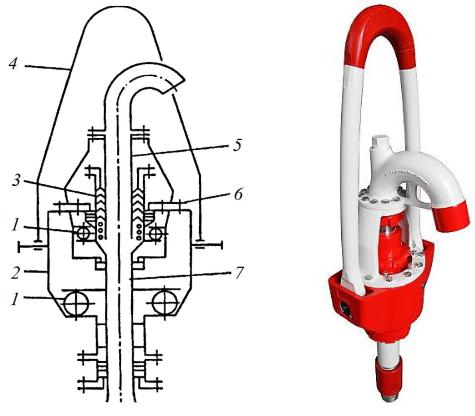 Вертлюг (рис. 2.9) – это механизм, соединяющий невращаю- Сщиеся талевую систему и буровой крюк с вращающимися бурильными трубами, а также обеспечивающий ввод в них бурового раствора под давлением. Корпус вертлюга 2 (рис. 2.9, а) подвешивается на буровом крюке (или крюкоблоке) с помощью штропа 4. В центре корпуса проходит напорная труба 5, переходящая в ствол 7, соединенный с бурильными трубами. Именно к напорной трубе присоединяется напорный рукав для подачи бурового раствора в скважину. Напорная труба и ствол жестко не связаны, а последний установлен в корпусе 2 на подшипниках 1, чем обеспечивается неподвижное положение штропа, корпуса и напорной трубы при вращении бурильных труб вместе со стволом. Для герметизации имеющихся зазоров между не-