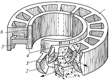 1 – наружный обод статора; 2 – лопатка ротора; 3 лопатка статора; 4 – внутренний ободАстатора; 5 наружный обод ротора;