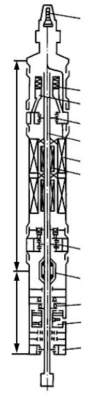 В трубном корпусе электробура размещен статор 6. Пакеты ротора 7 с алюминиевой обмоткой насажены на полом валу двигателя 5. Ротор расположен в статоре с зазором 0,5 – 0,6 мм на сторону. Внутренняя полость двигателя заполнена сухим изоляционным маслом. От внешней среды внутренняя полость двигателя изолирована верхним 4 и нижним 8 сальниками. В сальники подается машинное масло. Для компенсации утечек масла через сальники и поддержания некоторого избыточного давления внутри двигателя, препятствующего попаданию промывочной жидкости внутрь, в верхней части электробура в лубрикаторной головке размещены лубрикаторы двигателя 3 и сальника 2.