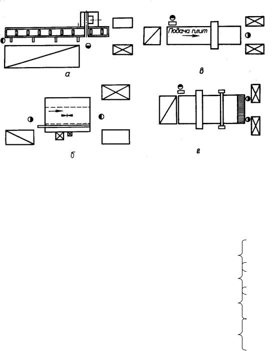 Рис. П.1. Схемы организации рабочих мест при раскрое: а – станок для торцевания досок; б – круглопильный станок для продольного раскроя; в – трехпильный обрезной станок ЦТЗФ; г – форматно-обрезной станок