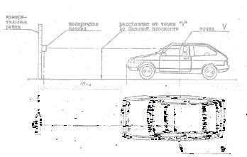Автомобиль устанавливается на горизонтальной площадке. Фотокамера размещается над сиденьем водителя с помощью координатного кронштейна, обеспечивающего достаточную жесткость, чтобы центр передней линзы объектива фотокамеры был расположен в точке "V". Установить фотокамеру по указателю уровня в горизонтальное положение. Установить измерительную рейку