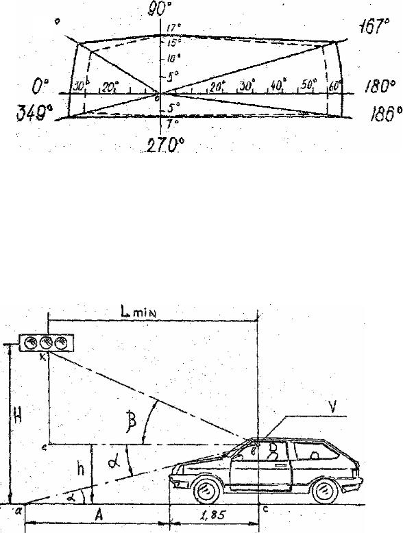Величина «мертвой зоны» и минимального расстояния видимости до висящего светофора определяются из треугольников abc и bek (рис. 5). Величины высоты подвеса светофора H и высоты глаз водителя над поверхностью земли задаются преподавателем или измеряются в процессе лабораторной работы. Углы α и β выбираются из таблицы (показатели 3 и 4).