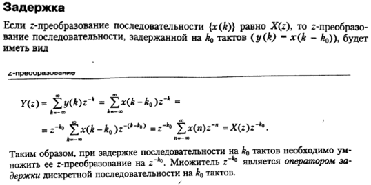 Z-преобразование смещенного сигнала. Пусть последовательность {yi = xi-m} получена путем задержки последовательности {xi} на m тактов дискретизации. Тогда при нулевых начальных условиях имеем: