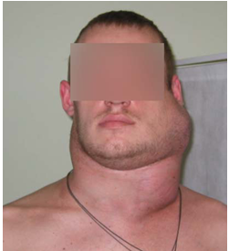 Объективно. Общее состояние средней тяжести. Лицо симметричное. Кожный покров с сероватым оттенком. В правой и левой поднижнечелюстных областях пальпируются лимфатические узлы с бугристой поверхностью, плотный консистенции, безболезненные, подвижные размерами 2,0х1,5х0,4 см. Открывание рта свободное.