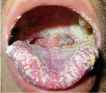 Пациент Н., 20 лет, обратился с жалобами на болезненность в языке, невозможность приема пищи, наличие серого налета в полости рта, общее недомогание.
