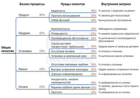 Следует обратить внимание, что цель этой системы стандартов - оценка качества работы. Более того, на ней представлены "нужды клиентов". Только один момент выдает в этой схеме внутреннее, производственное происхождение - все начинается с разделения общего качества на вклад отдельных бизнес-процессов (можно заменить бизнес-процессы на названия подразделений компании).