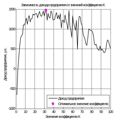 Значение коэффициента будем подбирать итеративно, рассматривая зависимость дохода предприятия от значений коэффициента и выбирая оптимальное значение.