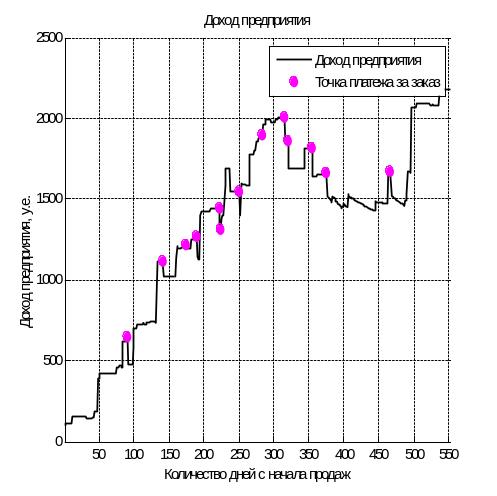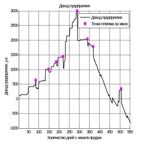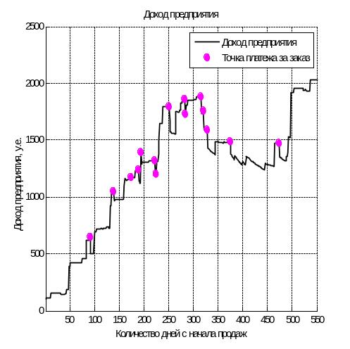 Из графиков видно, что полученная стратегия обеспечивает рост дохода предприятия на большом временном промежутке, хотя порой и наблюдаются локальные спады дохода.