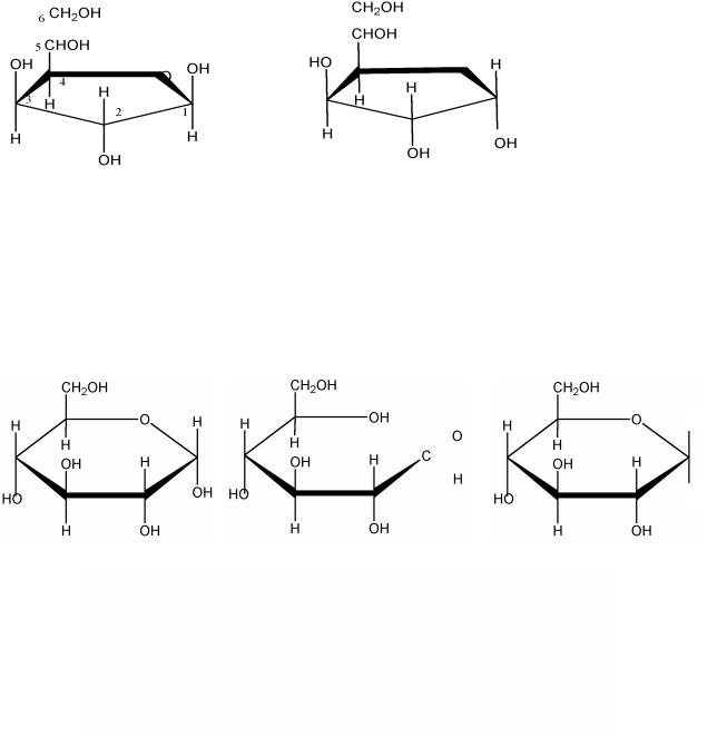 Полуацетальные формы кетоз также имеют либо шестичленное, либо пятичленное кислородосодержащие кольцо. Шестичленное кольцо (пираноза) образуется в результате взаимодействия кетонной группы при втором атоме углерода со спиртовой группой при шестом атоме углерода, а пятичленное (фураноза) – за счет взаимодействия со спиртовой группой 5-го углерода: