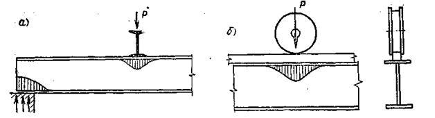 К местным напряжениям, возникающим из-за внешних воздействий, относятся напряжения в местах приложения сосредоточенных нагрузок - на опорах, в местах опирания каких-либо других конструкций (рис. а), под катками мостовых кранов в подкрановых балках (рис. б), в местах крепления вспомогательных элементов. Местные напряжения могут привести к развитию чрезмерных пластических деформаций, трещин или к потере устойчивости в тонких элементах сечений (например, стенки двутавра).