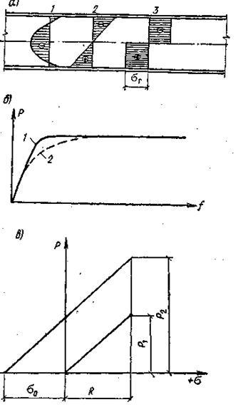 а - напряжения в балке двутаврового сечения (1 - начальные напряжения; 2 - напряжения от внешней нагрузки; 3 - суммарные напряжения при образовании шарнира пластичности); б - прогибы балки (1 - при отсутствии начальных напряжений; 2 - при наличии начальных напряжений); в - повышение несущей способности балок созданием предварительного напряжения; σо - предварительное напряжение; R - расчетное сопротивление; Р1 - максимальная нагрузка без предварительного напряжения; Р2 - то же, с предварительным напряжением