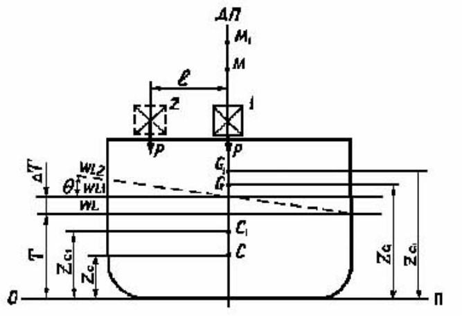 Первоначальное положение 1 (рис.8) такое, что центр тяжести груза совпал с вертикалью, проходящей через центр тяжести площади действующей ватерлинии судна, никакого наклонения судна не произойдет.