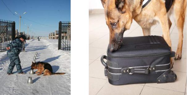 предметы не имеющие резких запахов, а в другой конус помещается чистый запах взрывчатых веществ, взрывных устройств, оружия и боеприпасов без примесей. Оба конуса выставляются в один ряд один возле другого на расстоянии не более 1 метра.