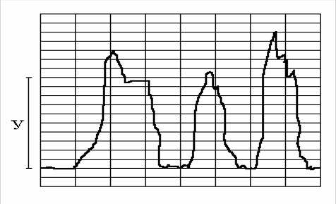 по расстоянию от нулевой линии до средней линии измерения (У). Первый всплеск в замерах не учитывается, так как он получается в начальный момент торможения колеса, когда оно полностью не заблокировано.