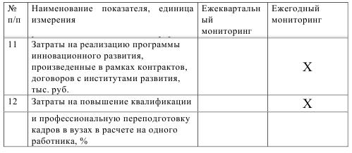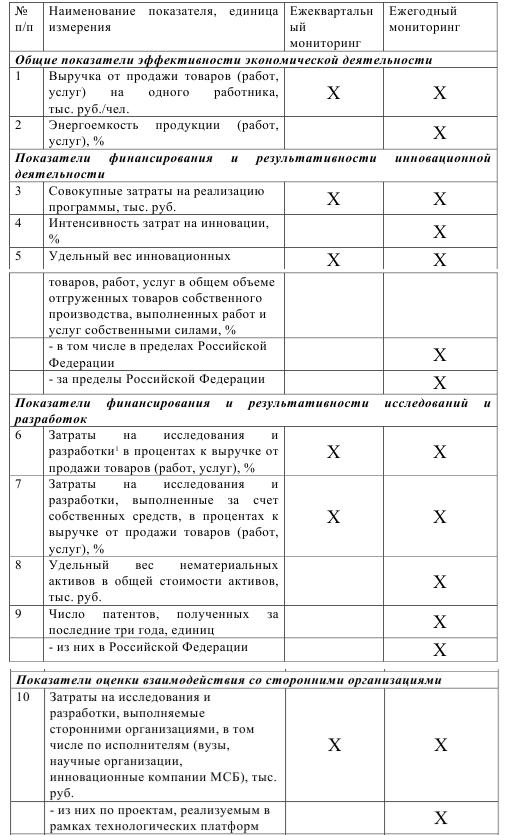 Наряду с вышеуказанными показателями, в систему показателей мониторинга хода реализации программы каждой из компаний входят все КПЭ, установленные в программе. При этом рекомендуется в перечне КПЭ, установленных в программе, рекомендуется выделить КПЭ, которые являются наиболее значимыми с точки зрения достижения основных целей реализации программы (не более 10 показателей). Кроме того, в систему показателей мониторинга входят показатели, установленные в программе в соответствии с рекомендациями по разработке программ инновационного развития акционерных обществ с государственным участием, государственных корпораций и федеральных государственных унитарных предприятий (утверждены решением Правительственной комиссии по высоким технологиям и инновациям от 3 августа 2010 г., протокол № 4).