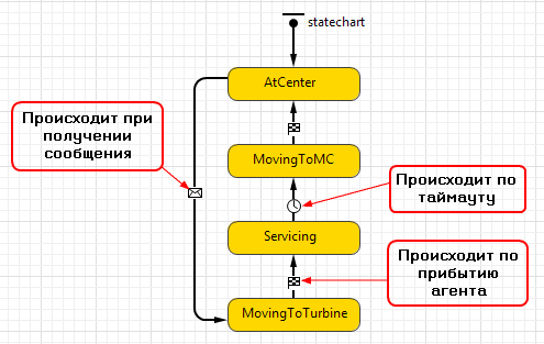 Состояния называются AtCenter (в сервисном центре), MovingToMC (движение к сервисному центру), Servicing (обслуживание турбины), MovingToTurbine (движение к турбине). Это, собственно, все действия и передвижения грузовиков и вертолетов в нашей модели (рисунок 12).