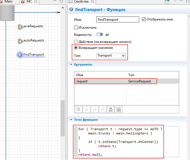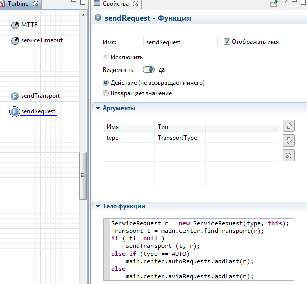 Добавим еще одну «Функцию» . Назовем ее sendRequest и зададим ее свойства, как указано на рисунке 17. В секции свойств «Аргументы» добавим аргумент TransportType type. Тело функции ссылается на функцию findTransport, которую мы ранее создали на диаграмме MC. Когда турбина отправляет запрос на обслуживание, сервисный центр должен отправлять соответствующий тип транспорта: AUTO или AVIA.