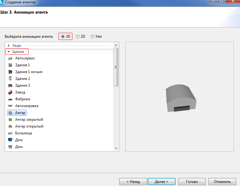 Третьим шагом в создании агента будет выбор типа анимации 3D, затем выберем фигуру анимации Ангар из секции «Здания» и щелкнем «Далее» (рисунок 3).