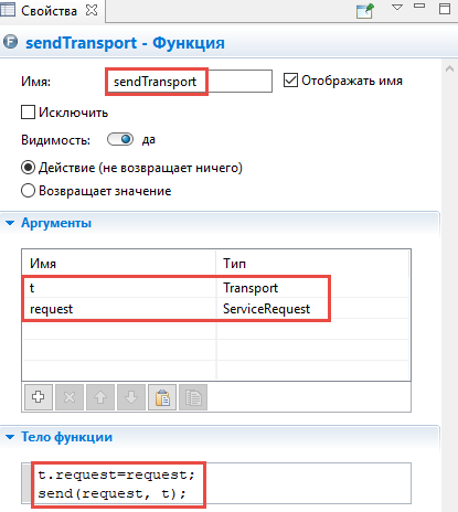 Называем функцию setTransportBase. Эта функция ничего не возвращает, поэтому оставляем выбранной опцию «Действие (не возвращает ничего)».