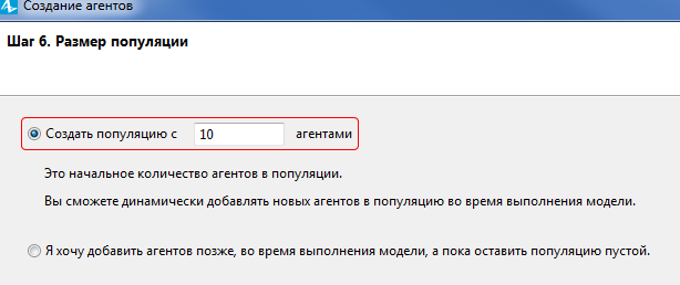 Нам не нужно сейчас создавать какие-либо параметры, так что пропускаем шаг 5. На шаге 6, задаем количество агентов, которые мы хотим видеть в этой популяции: 10 агентов (рисунок 5).