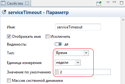 Параметр с именем MTTF (среднее время до аварии) имеет тип «Время» и его «Значение по умолчанию» равняется 50 дням. Дни можем выбрать в свойстве «Единица измерения». Второй параметр, serviceTimeout, также имеет тип «Время»; его «Значение по умолчанию» равняется 2 неделям (рисунок 15).