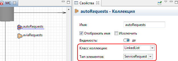 Назовем коллекции aviaRequests и autoRequests и обе имеют «Класс коллекции» LinkedList и «Тип элементов» ServiceRequest (рисунок 13).