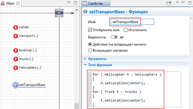 Нам осталось задать алгоритм функции. Разворачиваем секцию «Тело функции» в панели «Свойства» и вводим код Java, как указано на рисунке 14: