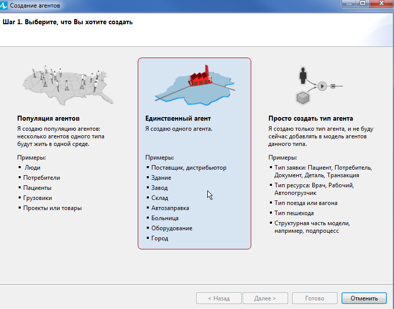 Выбираем опцию «Просто создать тип агента». Нам нужен тип агента, чтобы задать логику модели специальными параметрами, которые мы создадим на его диаграмме.