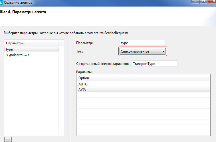 На шаге 4 мы создадим в мастере параметр, а также список вариантов. В нашем случае, нам необходимо различать грузовики и вертолеты в общем транспортном парке. Назовем параметр type и выберем его «Тип: Список вариантов». Так как в этой модели мы еще не создавали списков вариантов, по умолчанию мастер предлагает «Создать новый список вариантов:» вводим имя TransportType. Добавим варианты в таблицу, по одному в каждой строке: AUTO, AVIA (рисунок 6).