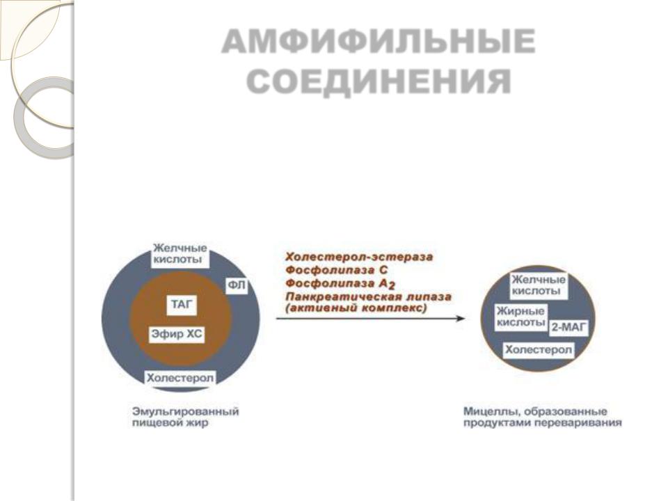 Желудочная и кишечная липазы малоактивны. Короткоцепочечные ЖК, образующиеся в результате гидролиза в желудке, участвуют в эмульгировании