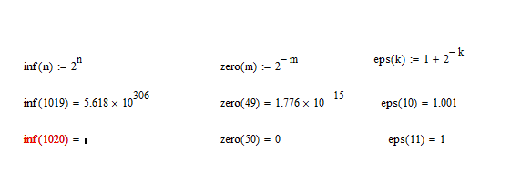 Написать в среде Mathcad функции для поиска значения машинного нуля, машинной бесконечности, машинного эпсилон.