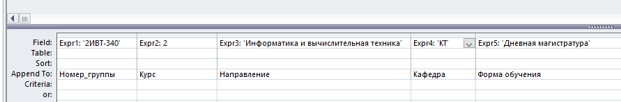 Строка «Добавить»(Append to) – заполняем из раскрывающегося списка поля таблицы, в которые надо внести данные.
