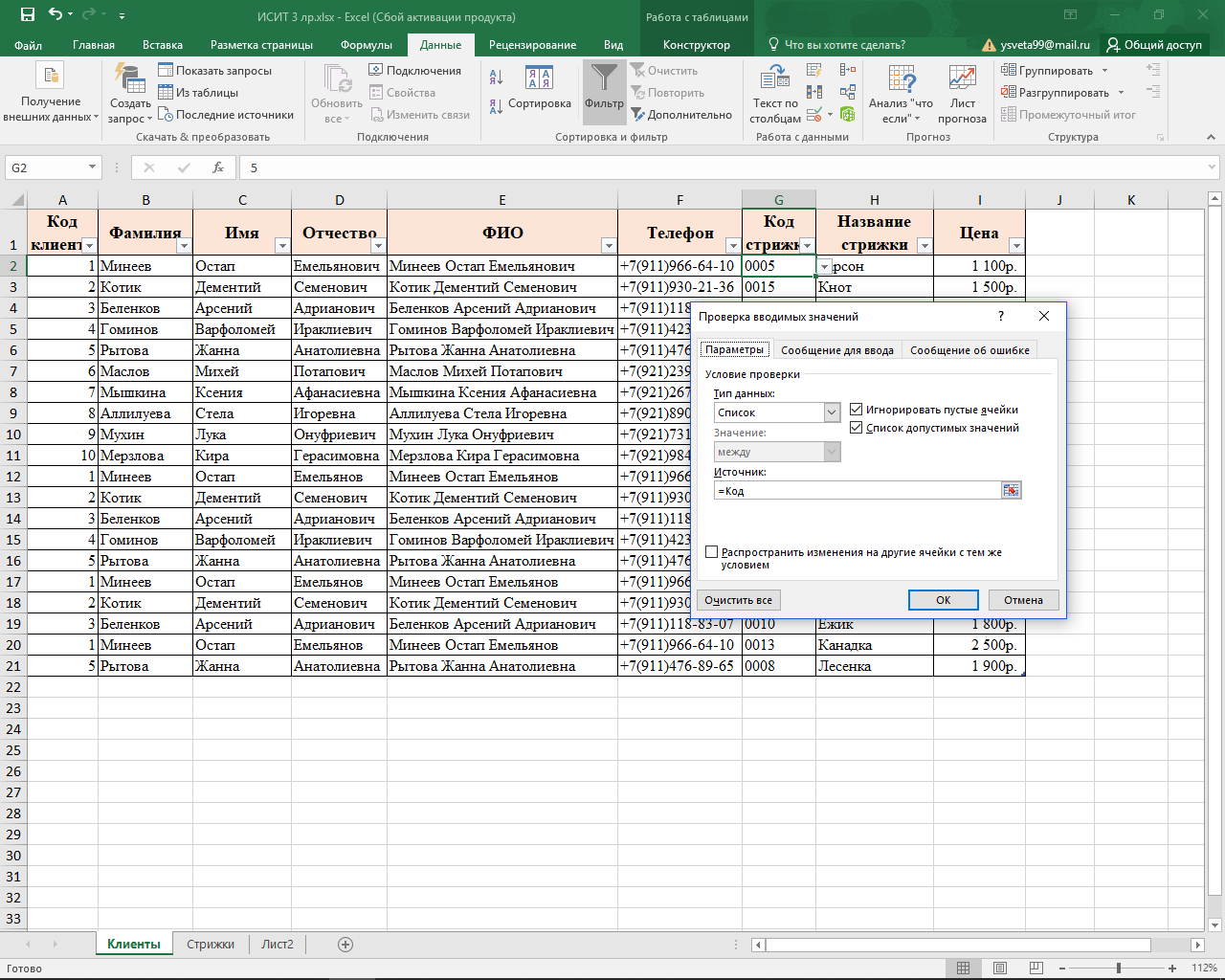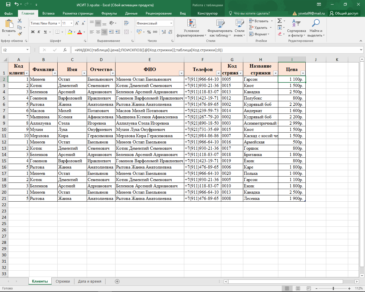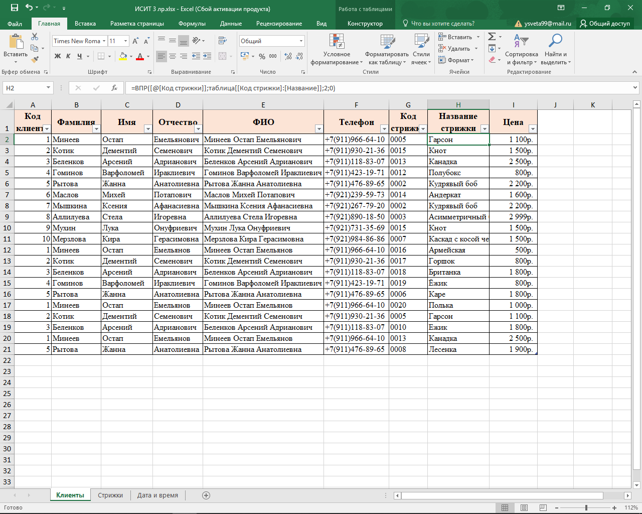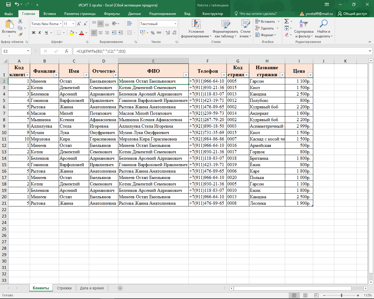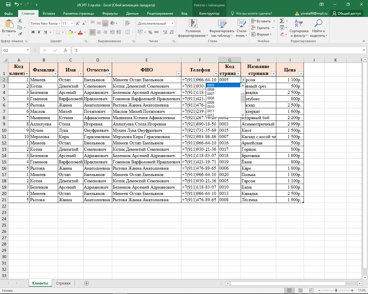 – Клиенты (Код клиента, Фамилия, Имя, Отчество, Телефон);