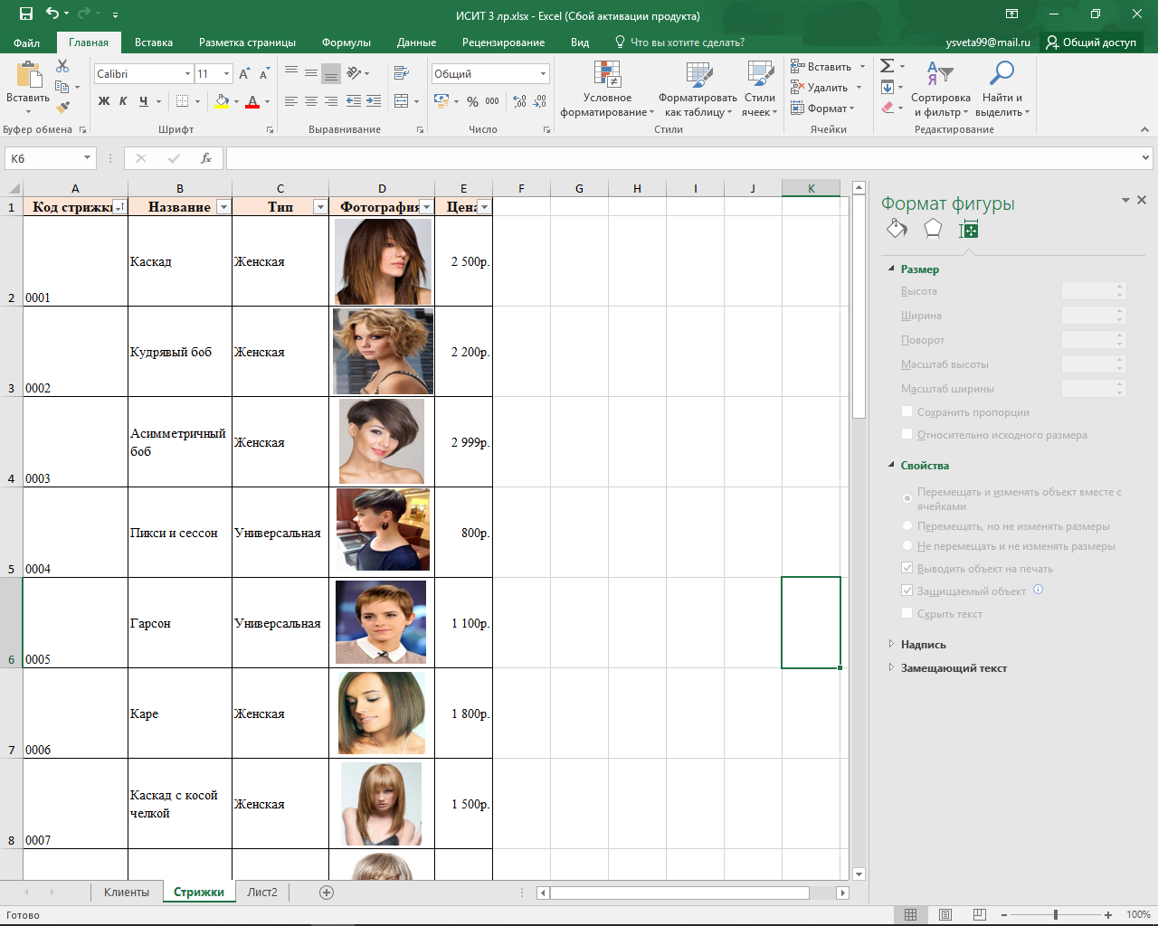 – Стрижки (Код стрижки, Название, Тип (мужская, женская, универсальная), Фотография, Цена);