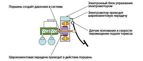 Здесь в приводе главного тормозного цилиндра установлена шариковинтовая передача с электромотором. Специальный блок управления анализирует положение педали и регулирует при помощи сервопривода давление в системе ради более эффективной рекуперации тормозной энергии. Прямая механическая связь педали с исполнительным механизмом тормозов тоже сохранена.