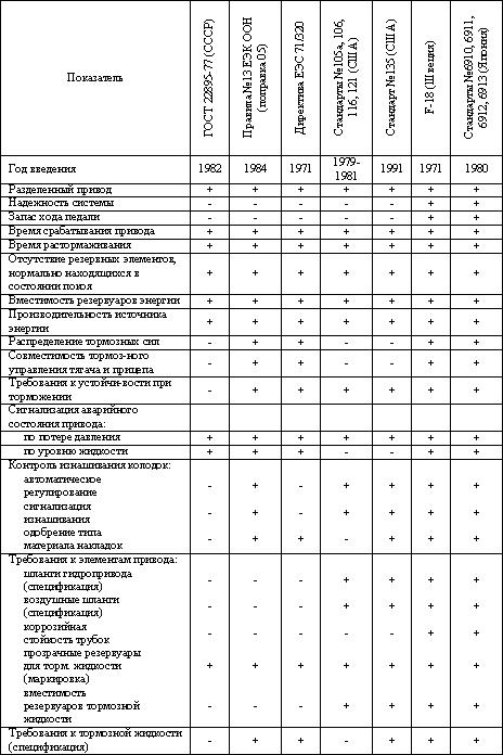 В связи с развитием экспорта отечественных автомобилей большой интерес представляет сравнение наших ГОСТ с международными предписаниями и национальными требованиями различных стран-экспортеров автомобильной техники. И, в частности, к элементам конструкции, определяющим одно из ее важнейших потребительских качеств - требования к тормозным системам АТС. В числе таких документов – ГОСТ 22895-95, Правила № 13 ЕЭК ООН, Директивы ЕЭС 71/320, шведские требования F-18, американские стандарты № 105а, 106, 116, 121, 135 (проект), а также японские стандарты № 6910, 6911, 6912, 6913 и др. Как видно из таблицы 3.1, где перечислены основные требования этих нормативных документов, большинство национальных стандартов базируется на Правилах ЕЭК ООН и Директивах ЕЭС [11].