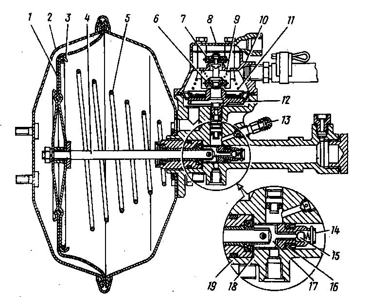 Вакуумный усилитель состоит из корпуса 22, крышки корпуса 10, корпуса клапанов 18, к которому тремя болтами с пружинными шайбами крепится поршень 13 с диафрагмой и соединитель поршней.