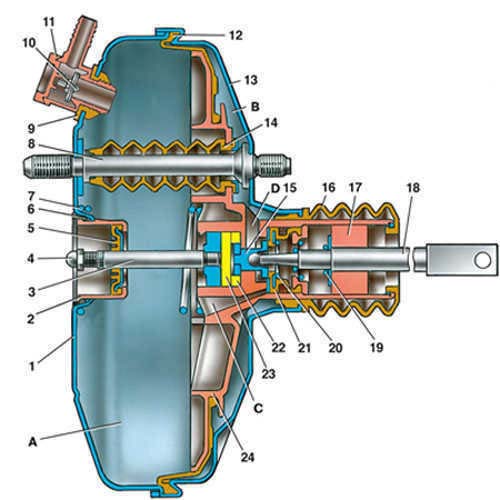 Резиновая диафрагма (рисунок 3.1) 12 вместе с корпусом 24 клапана делят полость вакуумного усилителя на две камеры: вакуумную А и атмосферную В. Камера А соединяется с впускной трубой двигателя через обратный клапан наконечника 11 и шланг [13].