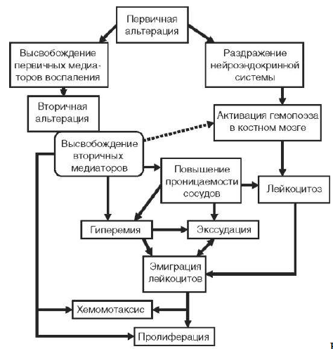 Патогенез воспаления представляет собой сложное сочетание нервных, гуморальных и эффекторных механизмов, лежащих в основе большого числа воспалительных феноменов, составляющих вышеперечисленные явления.